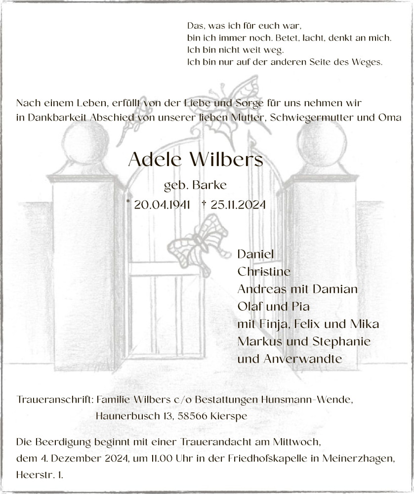 Hier finden Sie alle Traueranzeigen aus der Zeitung, die bisher für Adele Wilbers erschienen sind. Weitere Traueranzeigen, die in der Zeitung erscheinen, werden hier ebenfalls aufgelistet