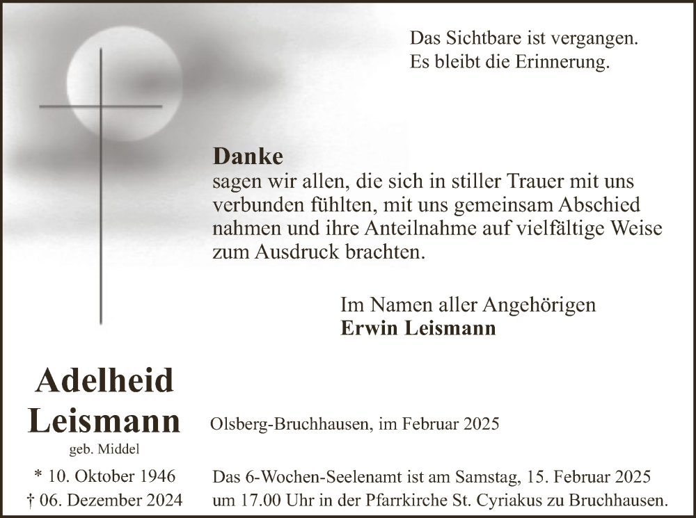 Hier finden Sie alle Traueranzeigen aus der Zeitung, die bisher für Adelheid Leismann erschienen sind. Weitere Traueranzeigen, die in der Zeitung erscheinen, werden hier ebenfalls aufgelistet