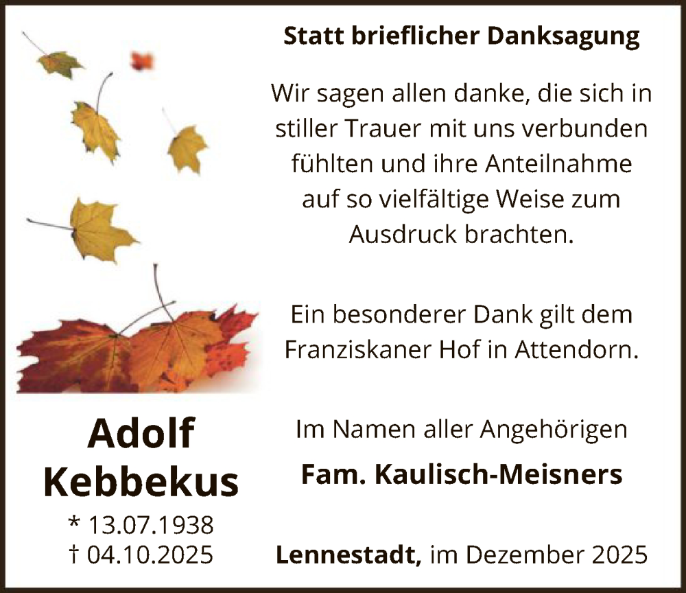Hier finden Sie alle Traueranzeigen aus der Zeitung, die bisher für Adolf Kebbekus erschienen sind. Weitere Traueranzeigen, die in der Zeitung erscheinen, werden hier ebenfalls aufgelistet