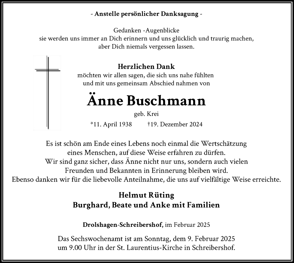 Hier finden Sie alle Traueranzeigen aus der Zeitung, die bisher für Änne Buschmann erschienen sind. Weitere Traueranzeigen, die in der Zeitung erscheinen, werden hier ebenfalls aufgelistet