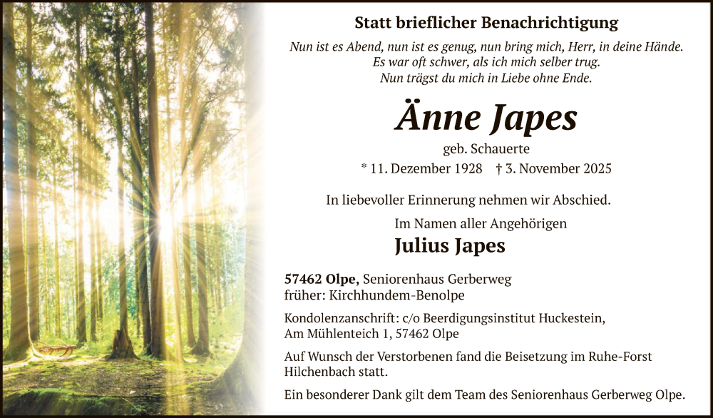Hier finden Sie alle Traueranzeigen aus der Zeitung, die bisher für Änne Japes erschienen sind. Weitere Traueranzeigen, die in der Zeitung erscheinen, werden hier ebenfalls aufgelistet