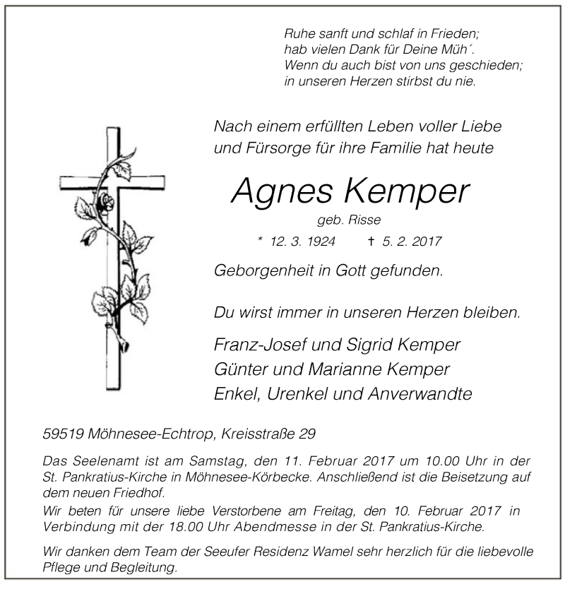 Hier finden Sie alle Traueranzeigen aus der Zeitung, die bisher für Agnes Kemper erschienen sind. Weitere Traueranzeigen, die in der Zeitung erscheinen, werden hier ebenfalls aufgelistet