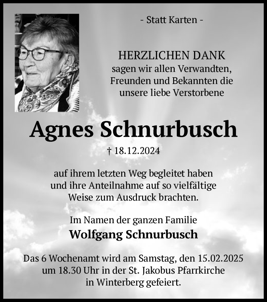 Hier finden Sie alle Traueranzeigen aus der Zeitung, die bisher für Agnes Schnurbusch erschienen sind. Weitere Traueranzeigen, die in der Zeitung erscheinen, werden hier ebenfalls aufgelistet