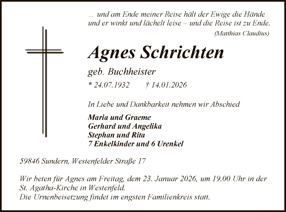 Hier finden Sie alle Traueranzeigen aus der Zeitung, die bisher für Agnes Schrichten erschienen sind. Weitere Traueranzeigen, die in der Zeitung erscheinen, werden hier ebenfalls aufgelistet