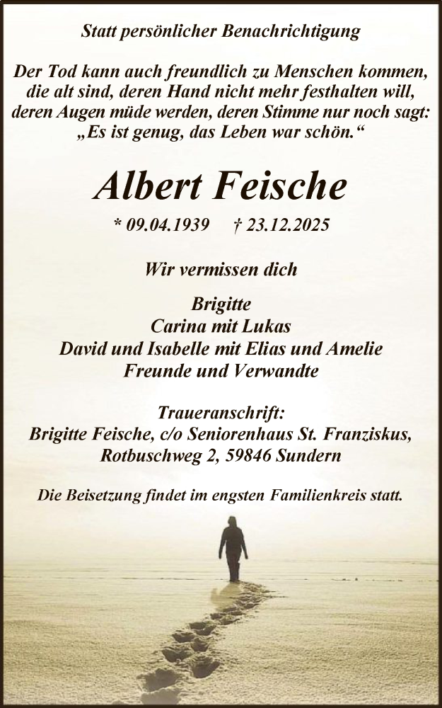 Hier finden Sie alle Traueranzeigen aus der Zeitung, die bisher für Albert Feische erschienen sind. Weitere Traueranzeigen, die in der Zeitung erscheinen, werden hier ebenfalls aufgelistet