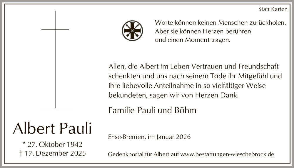 Hier finden Sie alle Traueranzeigen aus der Zeitung, die bisher für Albert Pauli erschienen sind. Weitere Traueranzeigen, die in der Zeitung erscheinen, werden hier ebenfalls aufgelistet