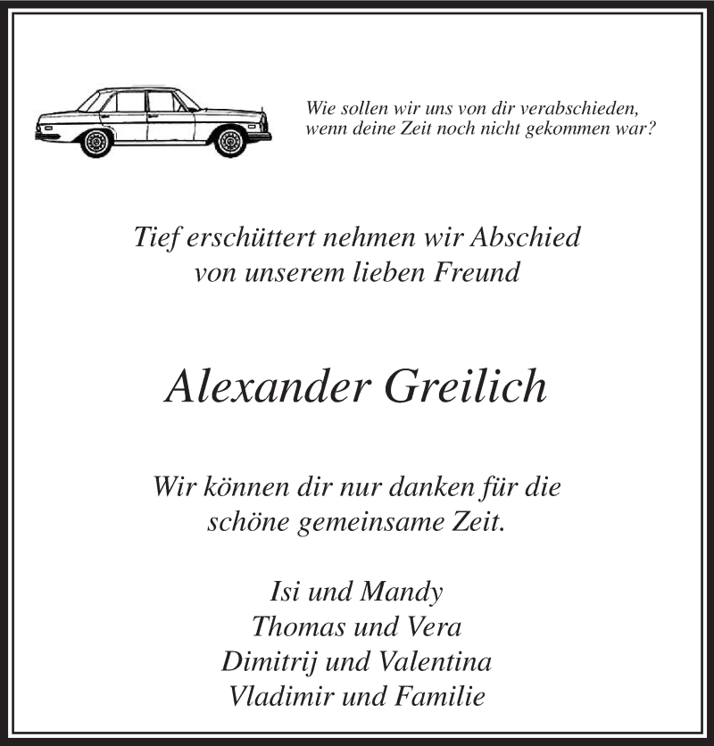 Hier finden Sie alle Traueranzeigen aus der Zeitung, die bisher für Alexander Greilich erschienen sind. Weitere Traueranzeigen, die in der Zeitung erscheinen, werden hier ebenfalls aufgelistet