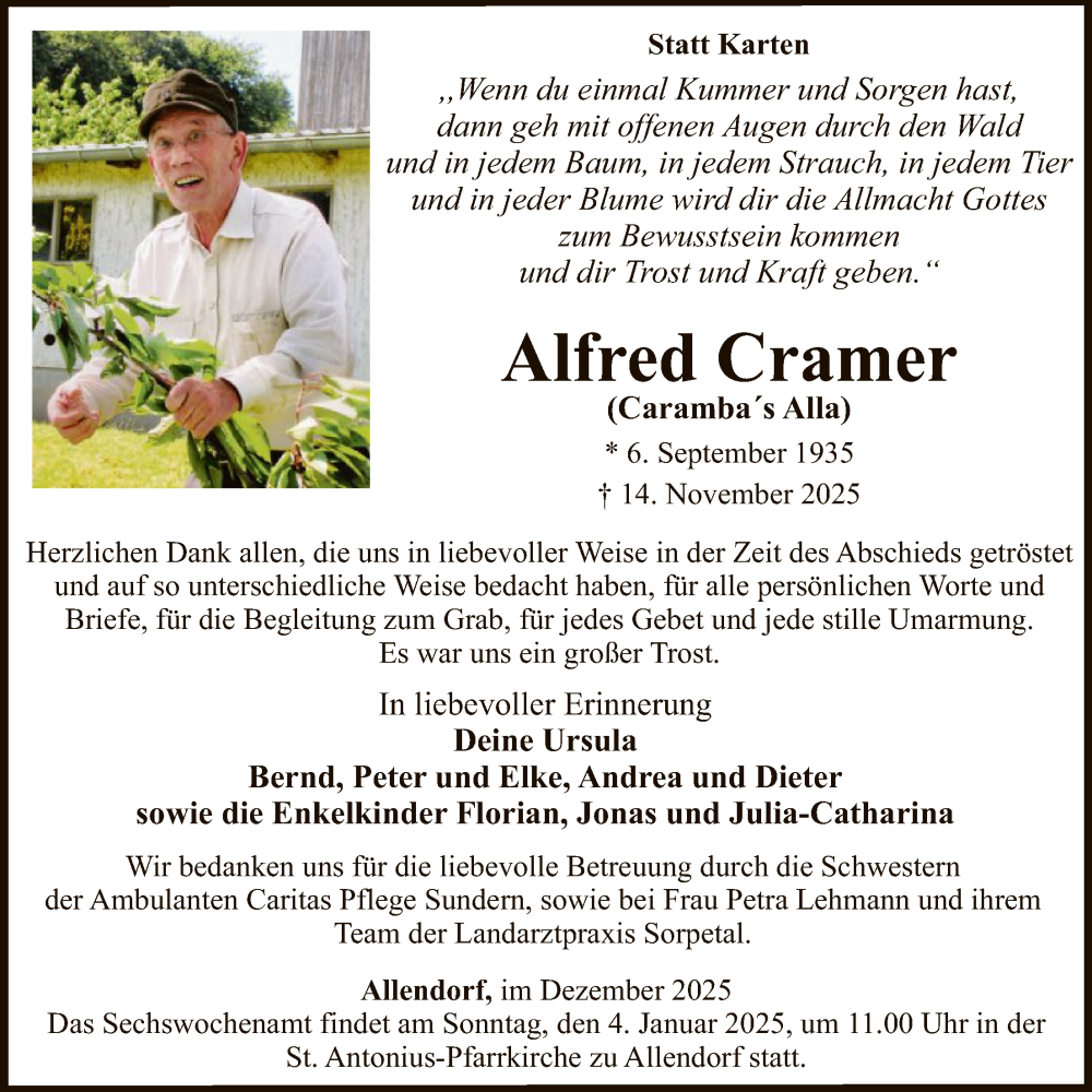 Hier finden Sie alle Traueranzeigen aus der Zeitung, die bisher für Alfred Cramer erschienen sind. Weitere Traueranzeigen, die in der Zeitung erscheinen, werden hier ebenfalls aufgelistet