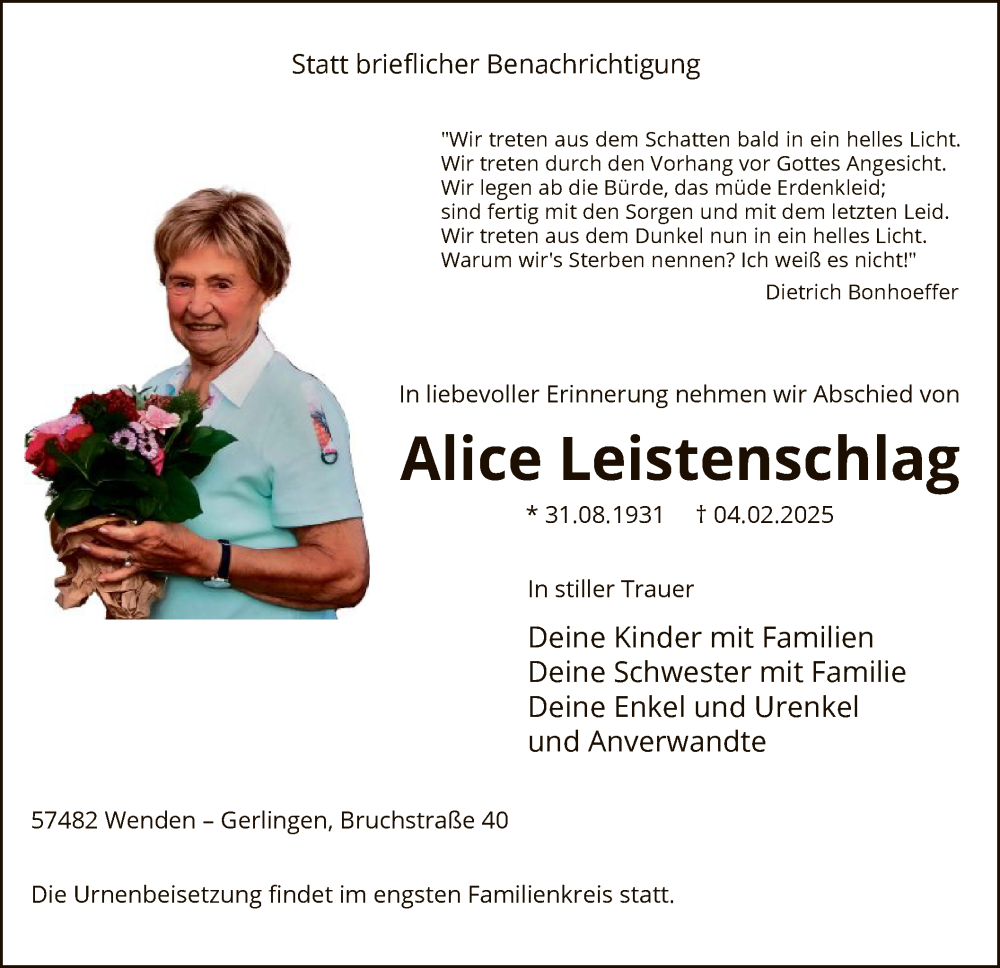 Hier finden Sie alle Traueranzeigen aus der Zeitung, die bisher für Alice Leistenschlag erschienen sind. Weitere Traueranzeigen, die in der Zeitung erscheinen, werden hier ebenfalls aufgelistet