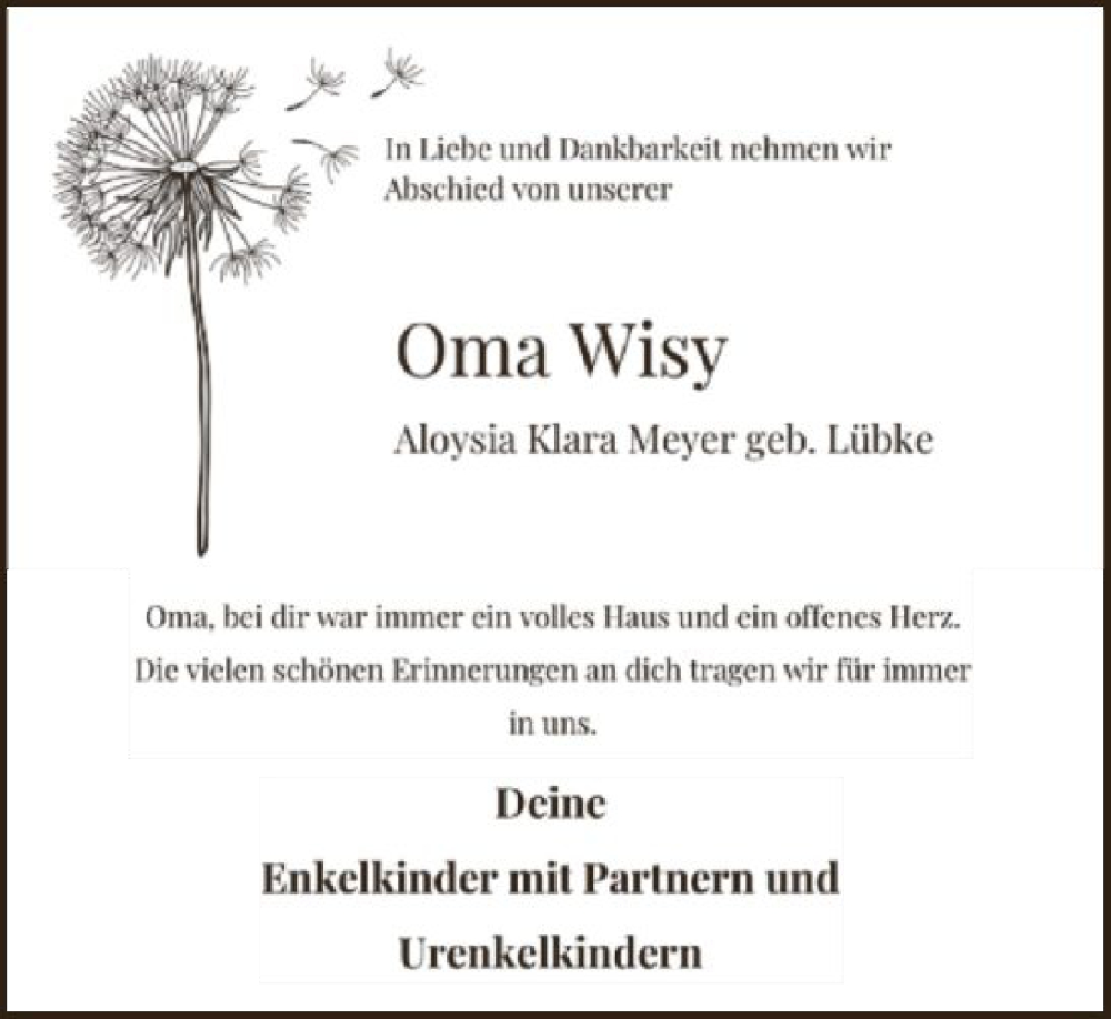 Hier finden Sie alle Traueranzeigen aus der Zeitung, die bisher für Aloysia Klara Meyer erschienen sind. Weitere Traueranzeigen, die in der Zeitung erscheinen, werden hier ebenfalls aufgelistet