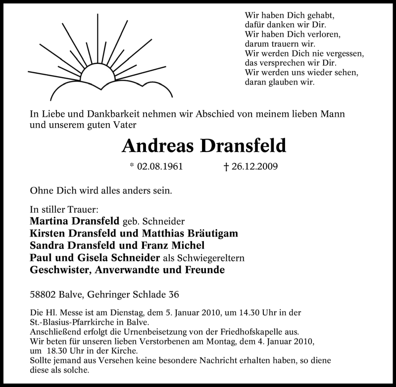 Hier finden Sie alle Traueranzeigen aus der Zeitung, die bisher für Andreas Dransfeld erschienen sind. Weitere Traueranzeigen, die in der Zeitung erscheinen, werden hier ebenfalls aufgelistet