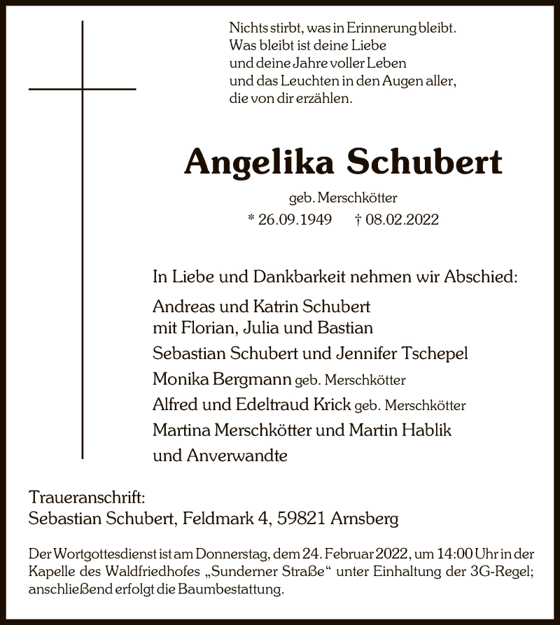 Hier finden Sie alle Traueranzeigen aus der Zeitung, die bisher für Angelika Schubert erschienen sind. Weitere Traueranzeigen, die in der Zeitung erscheinen, werden hier ebenfalls aufgelistet