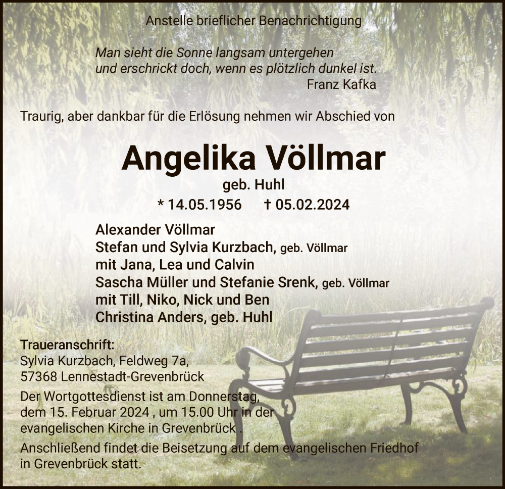 Hier finden Sie alle Traueranzeigen aus der Zeitung, die bisher für Angelika Völlmar erschienen sind. Weitere Traueranzeigen, die in der Zeitung erscheinen, werden hier ebenfalls aufgelistet