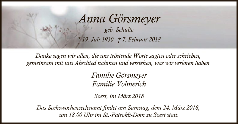 Hier finden Sie alle Traueranzeigen aus der Zeitung, die bisher für Anna Görsmeyer erschienen sind. Weitere Traueranzeigen, die in der Zeitung erscheinen, werden hier ebenfalls aufgelistet