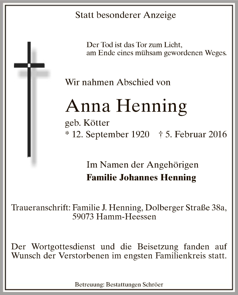 Hier finden Sie alle Traueranzeigen aus der Zeitung, die bisher für Anna Henning erschienen sind. Weitere Traueranzeigen, die in der Zeitung erscheinen, werden hier ebenfalls aufgelistet