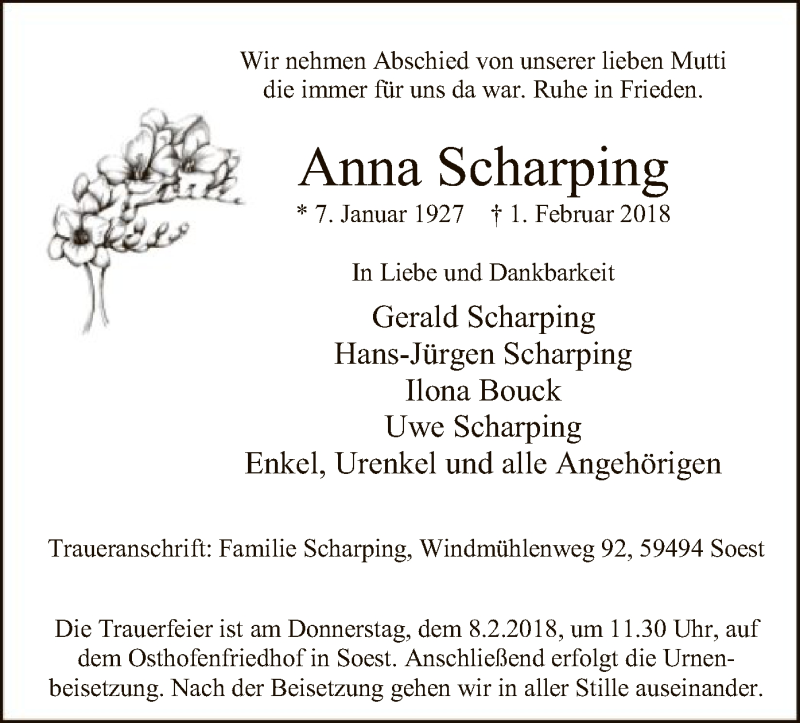 Hier finden Sie alle Traueranzeigen aus der Zeitung, die bisher für Anna Scharping erschienen sind. Weitere Traueranzeigen, die in der Zeitung erscheinen, werden hier ebenfalls aufgelistet