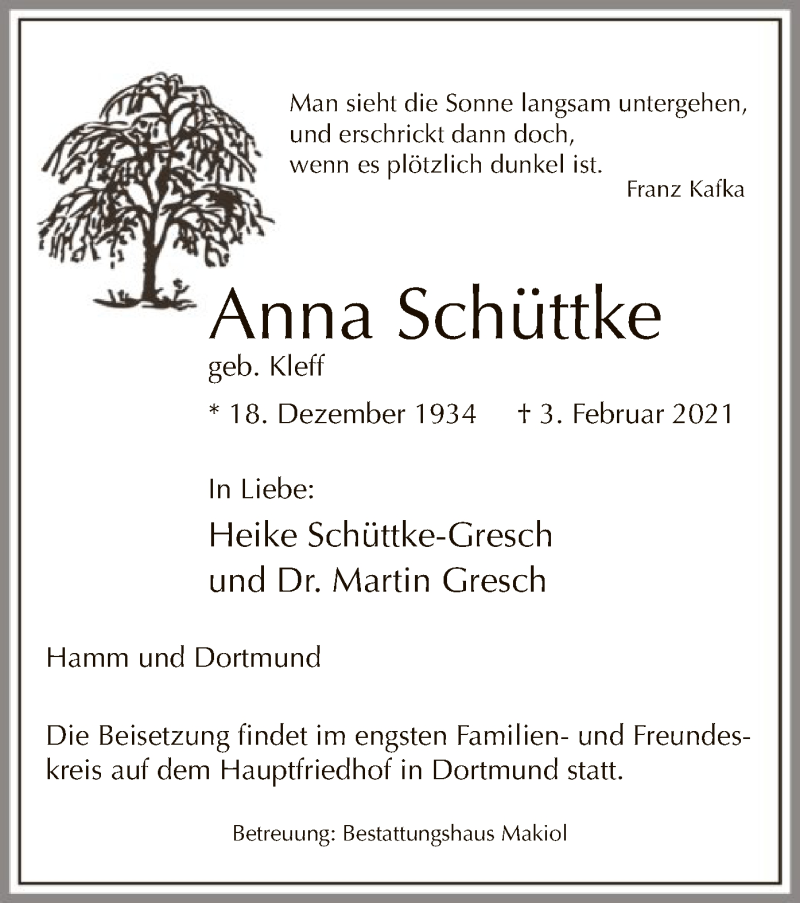 Hier finden Sie alle Traueranzeigen aus der Zeitung, die bisher für Anna Schüttke erschienen sind. Weitere Traueranzeigen, die in der Zeitung erscheinen, werden hier ebenfalls aufgelistet