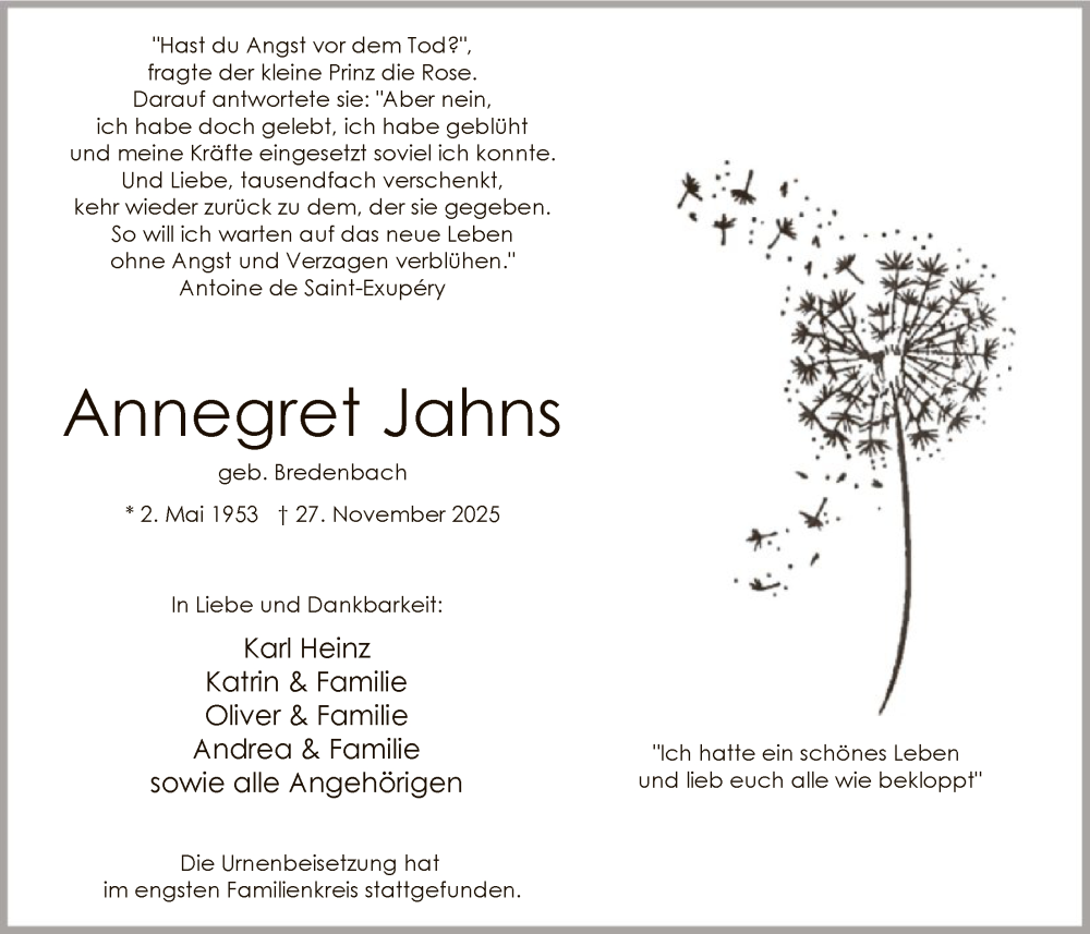 Hier finden Sie alle Traueranzeigen aus der Zeitung, die bisher für Annegret Jahns erschienen sind. Weitere Traueranzeigen, die in der Zeitung erscheinen, werden hier ebenfalls aufgelistet