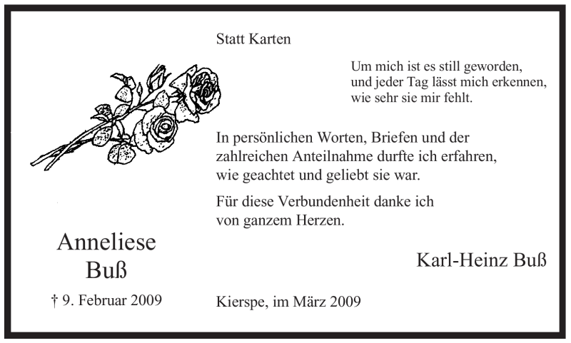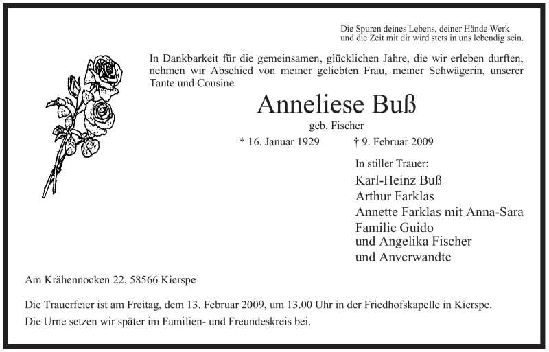 Hier finden Sie alle Traueranzeigen aus der Zeitung, die bisher für Anneliese Buß erschienen sind. Weitere Traueranzeigen, die in der Zeitung erscheinen, werden hier ebenfalls aufgelistet