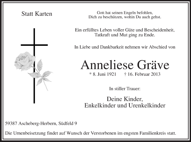 Hier finden Sie alle Traueranzeigen aus der Zeitung, die bisher für Anneliese Gräve erschienen sind. Weitere Traueranzeigen, die in der Zeitung erscheinen, werden hier ebenfalls aufgelistet
