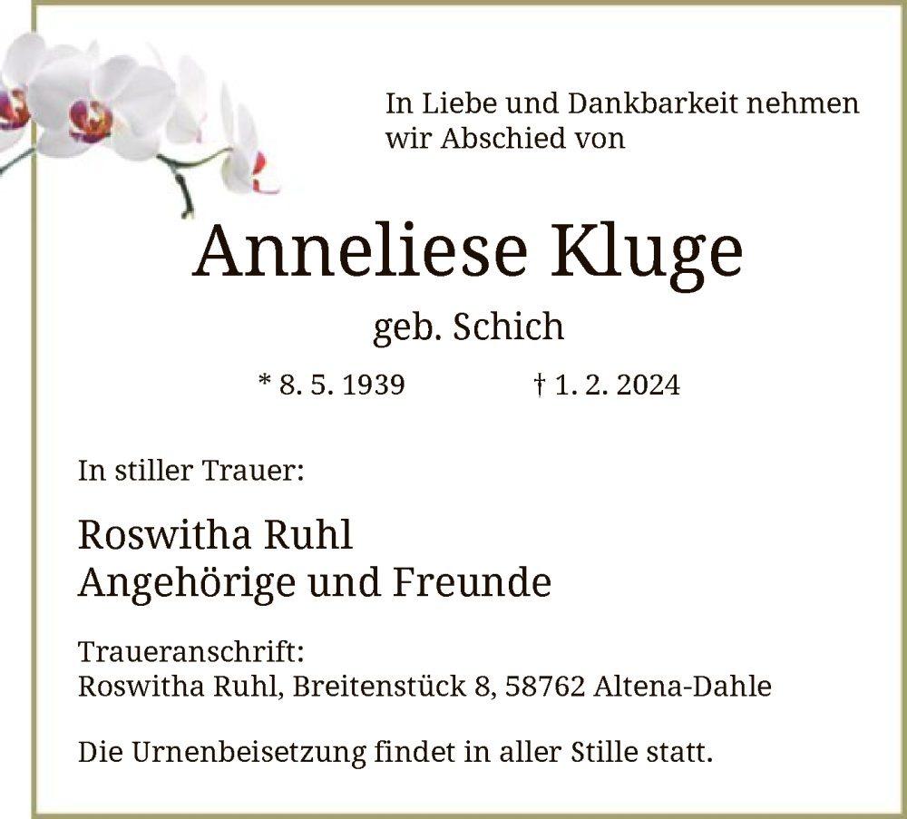 Hier finden Sie alle Traueranzeigen aus der Zeitung, die bisher für Anneliese Kluge erschienen sind. Weitere Traueranzeigen, die in der Zeitung erscheinen, werden hier ebenfalls aufgelistet
