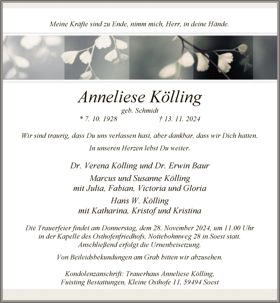 Hier finden Sie alle Traueranzeigen aus der Zeitung, die bisher für Anneliese Kölling erschienen sind. Weitere Traueranzeigen, die in der Zeitung erscheinen, werden hier ebenfalls aufgelistet