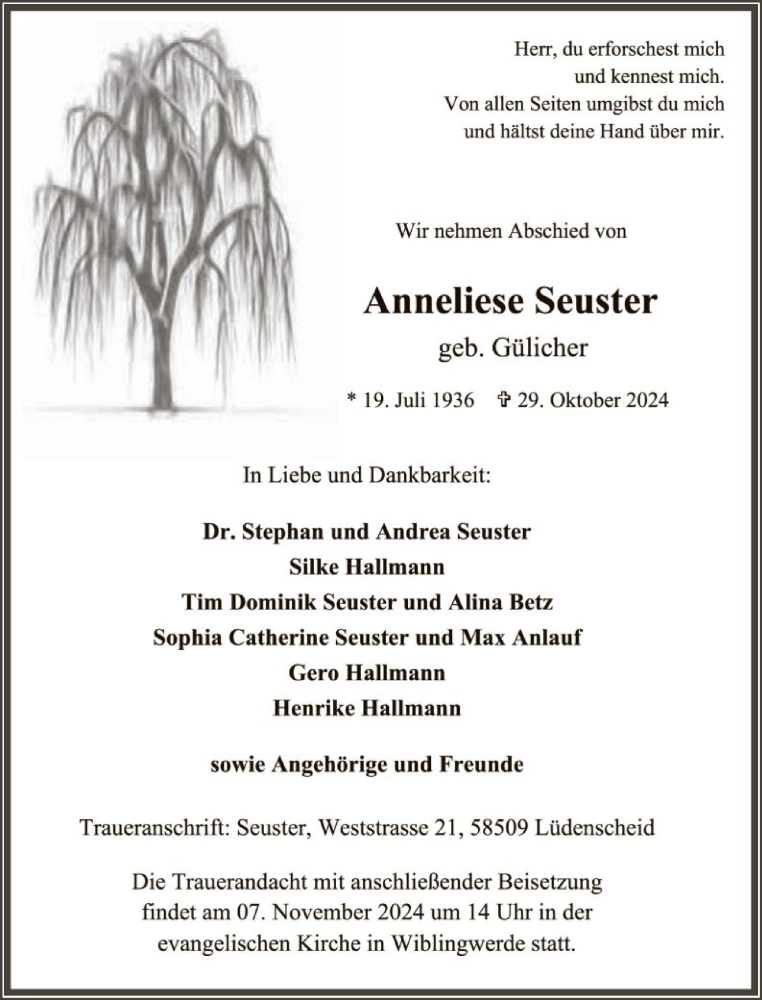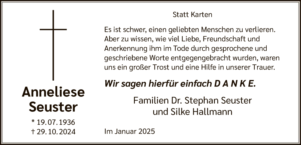 Hier finden Sie alle Traueranzeigen aus der Zeitung, die bisher für Anneliese Seuster erschienen sind. Weitere Traueranzeigen, die in der Zeitung erscheinen, werden hier ebenfalls aufgelistet