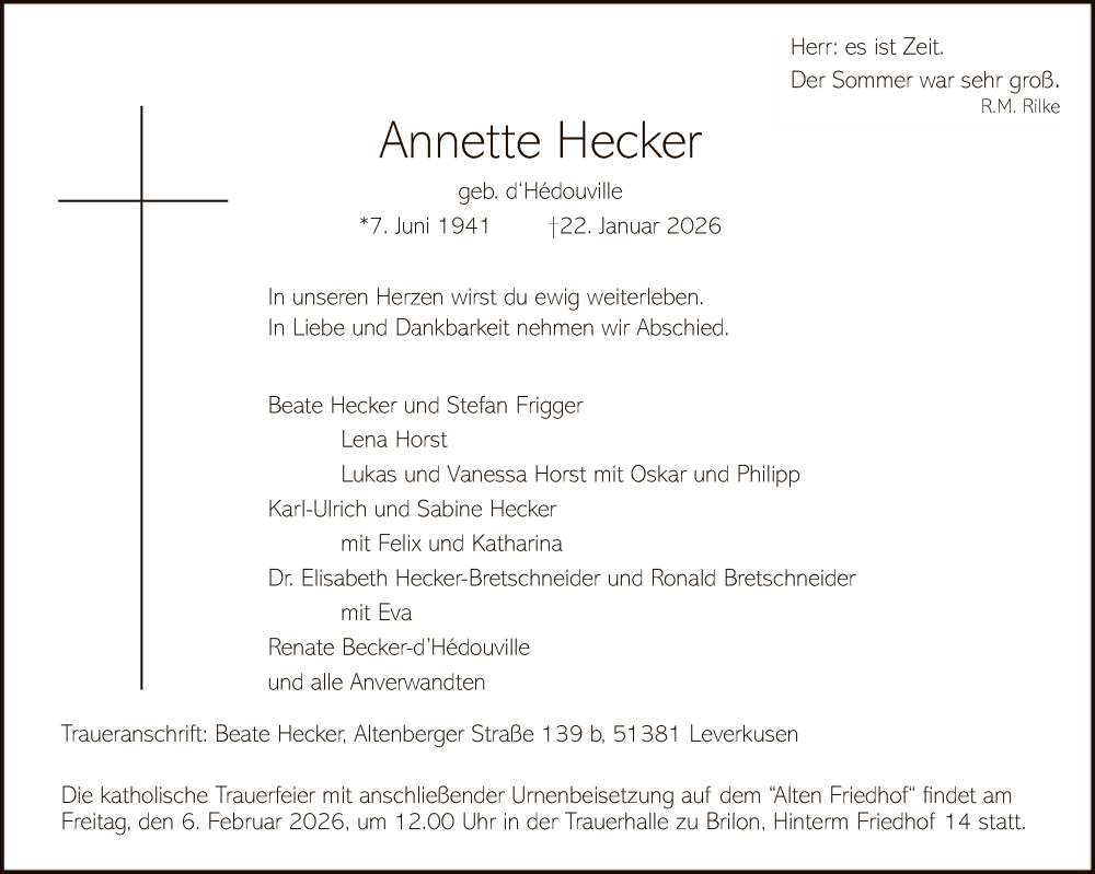 Hier finden Sie alle Traueranzeigen aus der Zeitung, die bisher für Annette Hecker erschienen sind. Weitere Traueranzeigen, die in der Zeitung erscheinen, werden hier ebenfalls aufgelistet