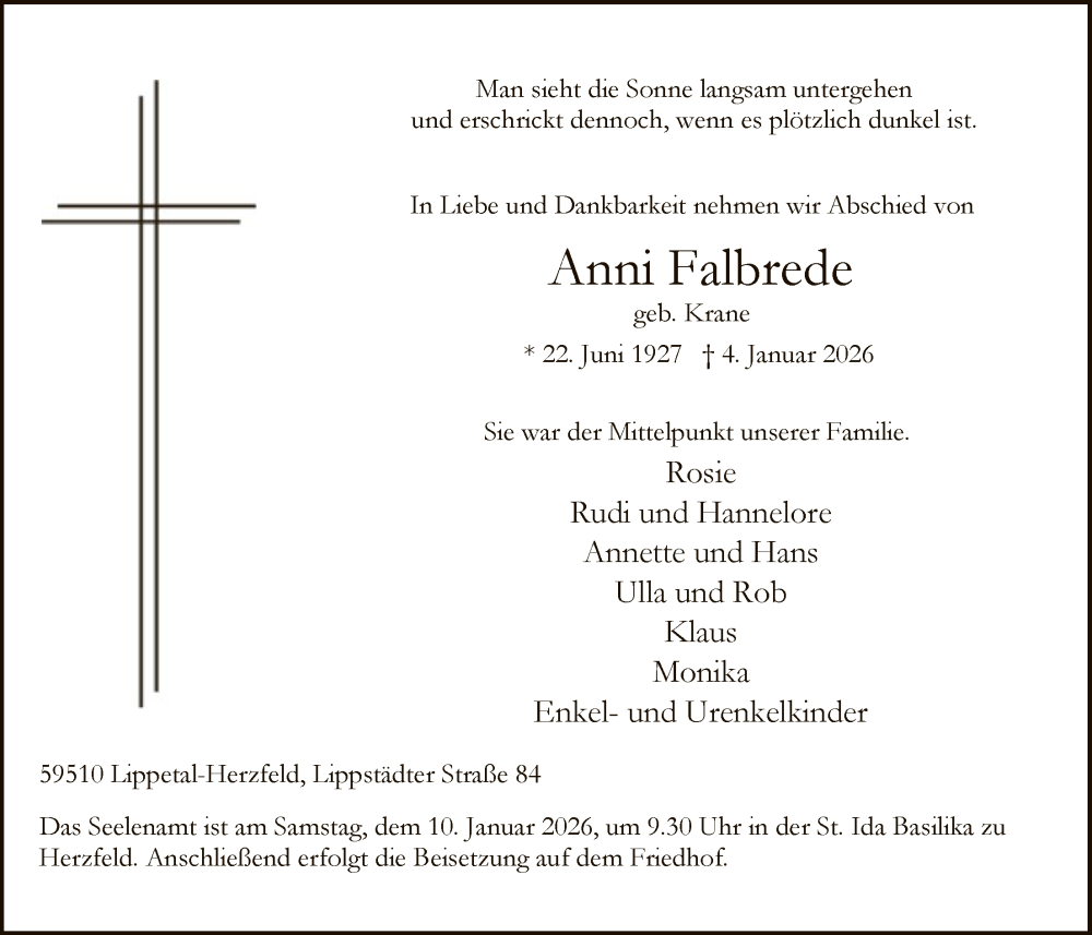 Hier finden Sie alle Traueranzeigen aus der Zeitung, die bisher für Anni Falbrede erschienen sind. Weitere Traueranzeigen, die in der Zeitung erscheinen, werden hier ebenfalls aufgelistet