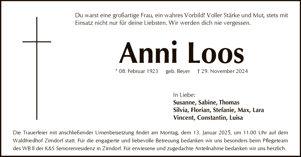 Hier finden Sie alle Traueranzeigen aus der Zeitung, die bisher für Anni Loos erschienen sind. Weitere Traueranzeigen, die in der Zeitung erscheinen, werden hier ebenfalls aufgelistet