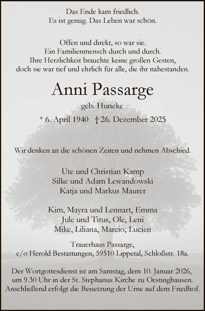 Hier finden Sie alle Traueranzeigen aus der Zeitung, die bisher für Anni Passarge erschienen sind. Weitere Traueranzeigen, die in der Zeitung erscheinen, werden hier ebenfalls aufgelistet