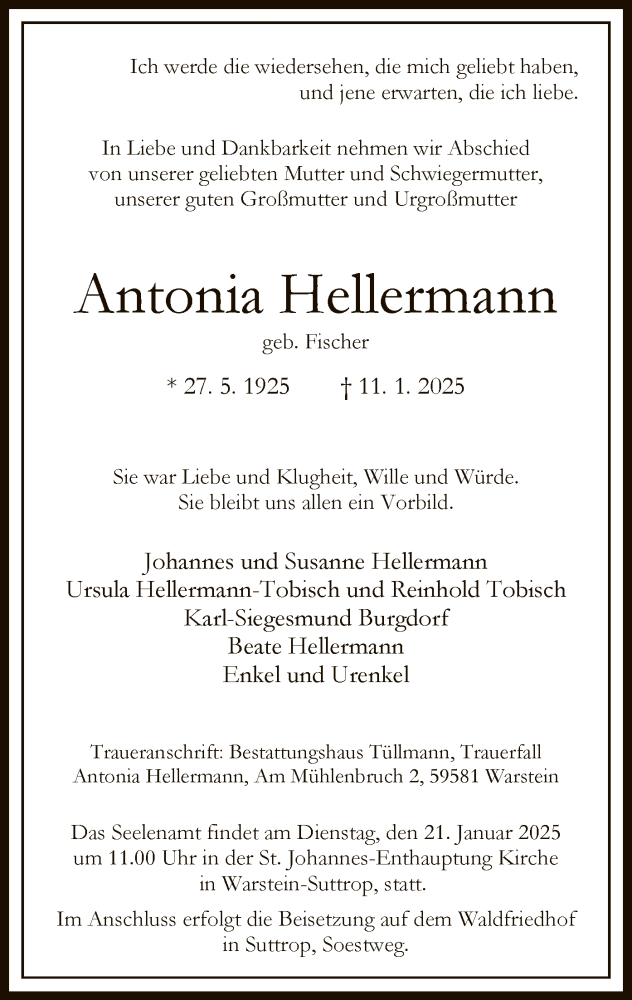 Hier finden Sie alle Traueranzeigen aus der Zeitung, die bisher für Antonia Hellermann erschienen sind. Weitere Traueranzeigen, die in der Zeitung erscheinen, werden hier ebenfalls aufgelistet
