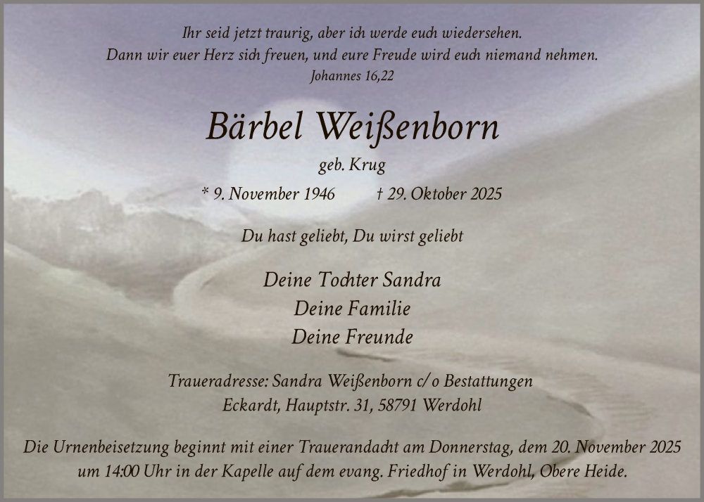 Hier finden Sie alle Traueranzeigen aus der Zeitung, die bisher für Bärbel Weißenborn erschienen sind. Weitere Traueranzeigen, die in der Zeitung erscheinen, werden hier ebenfalls aufgelistet