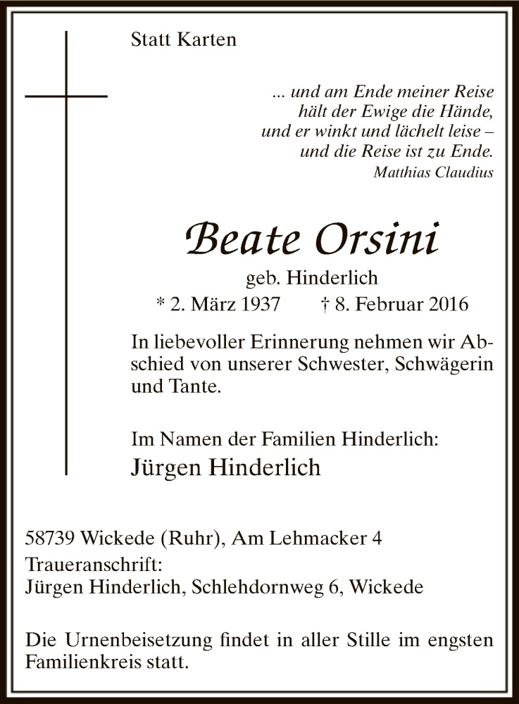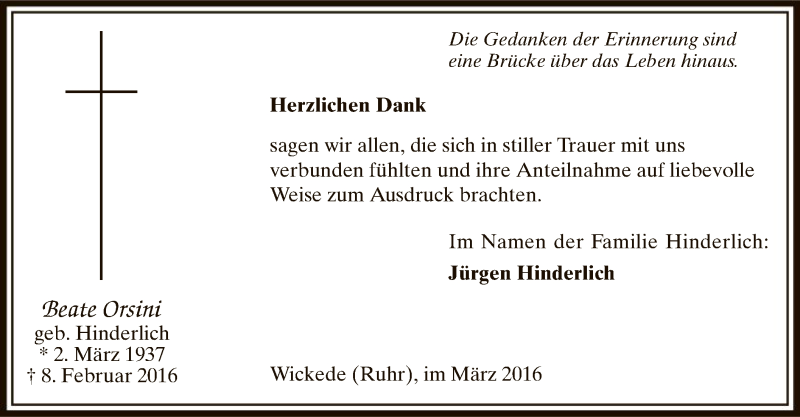 Hier finden Sie alle Traueranzeigen aus der Zeitung, die bisher für Beate Orsini erschienen sind. Weitere Traueranzeigen, die in der Zeitung erscheinen, werden hier ebenfalls aufgelistet