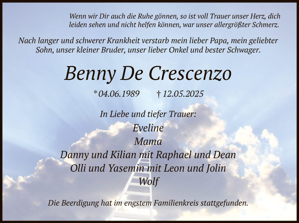 Hier finden Sie alle Traueranzeigen aus der Zeitung, die bisher für Benny De Crescenzo erschienen sind. Weitere Traueranzeigen, die in der Zeitung erscheinen, werden hier ebenfalls aufgelistet