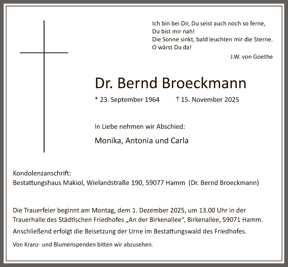 Hier finden Sie alle Traueranzeigen aus der Zeitung, die bisher für Bernd Broeckmann erschienen sind. Weitere Traueranzeigen, die in der Zeitung erscheinen, werden hier ebenfalls aufgelistet