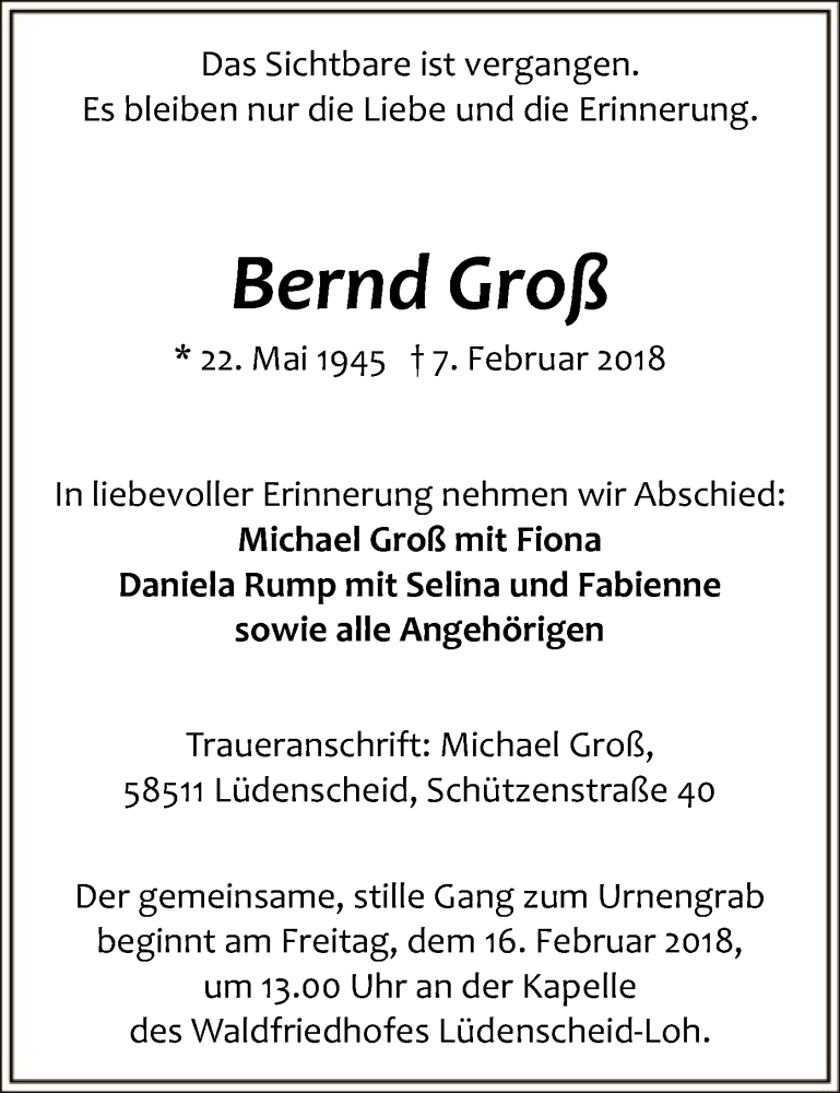 Hier finden Sie alle Traueranzeigen aus der Zeitung, die bisher für Bernd Groß erschienen sind. Weitere Traueranzeigen, die in der Zeitung erscheinen, werden hier ebenfalls aufgelistet