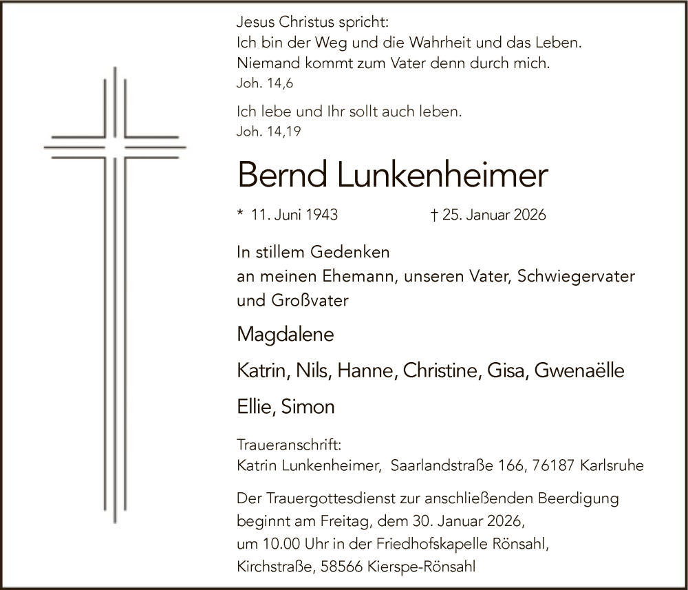Hier finden Sie alle Traueranzeigen aus der Zeitung, die bisher für Bernd Lunkenheimer erschienen sind. Weitere Traueranzeigen, die in der Zeitung erscheinen, werden hier ebenfalls aufgelistet