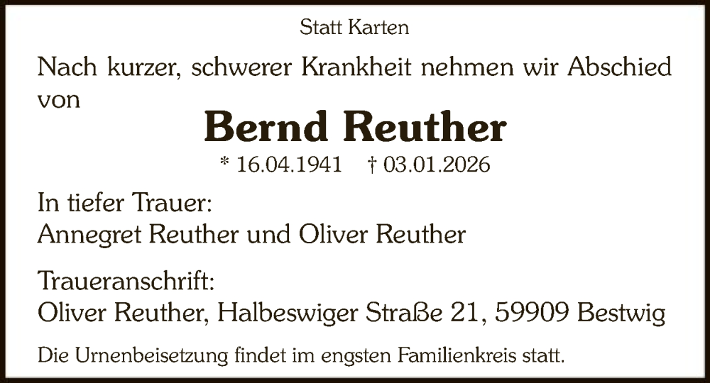 Hier finden Sie alle Traueranzeigen aus der Zeitung, die bisher für Bernd Reuther erschienen sind. Weitere Traueranzeigen, die in der Zeitung erscheinen, werden hier ebenfalls aufgelistet