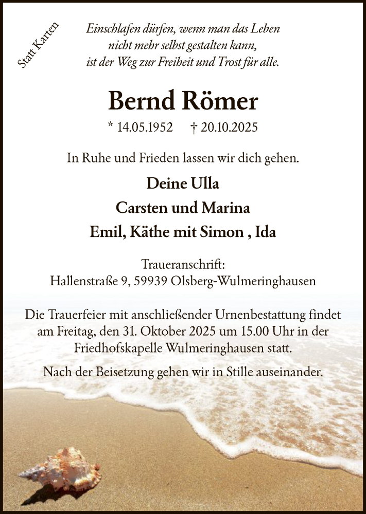 Hier finden Sie alle Traueranzeigen aus der Zeitung, die bisher für Bernd Römer erschienen sind. Weitere Traueranzeigen, die in der Zeitung erscheinen, werden hier ebenfalls aufgelistet