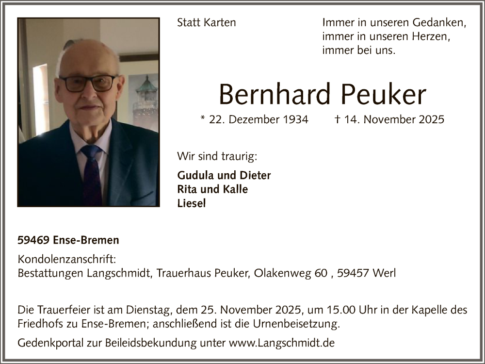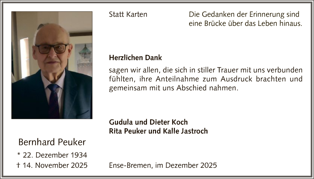 Hier finden Sie alle Traueranzeigen aus der Zeitung, die bisher für Bernhard Peuker erschienen sind. Weitere Traueranzeigen, die in der Zeitung erscheinen, werden hier ebenfalls aufgelistet