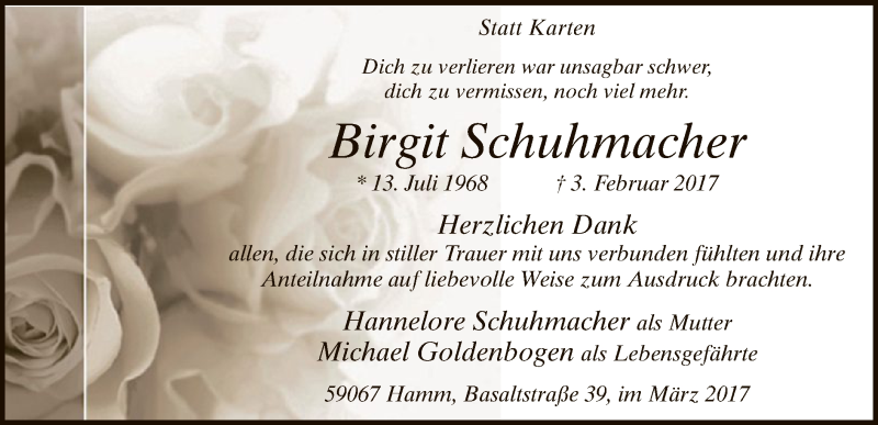 Hier finden Sie alle Traueranzeigen aus der Zeitung, die bisher für Birgit Schuhmacher erschienen sind. Weitere Traueranzeigen, die in der Zeitung erscheinen, werden hier ebenfalls aufgelistet