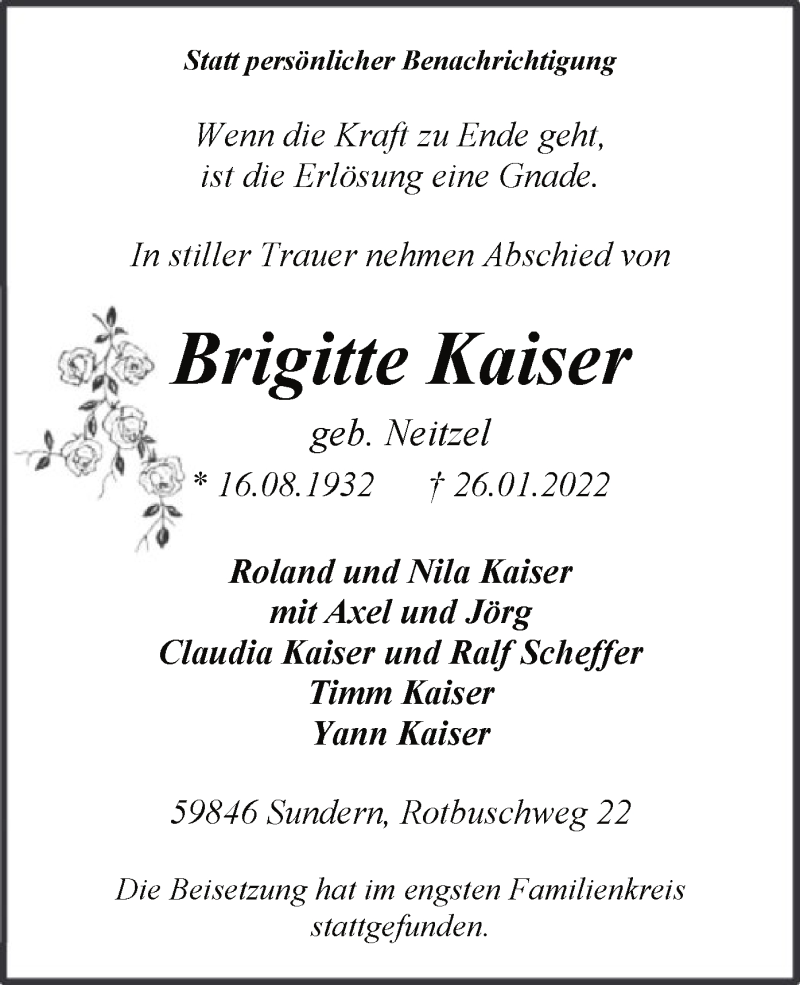 Hier finden Sie alle Traueranzeigen aus der Zeitung, die bisher für Brigitte Kaiser erschienen sind. Weitere Traueranzeigen, die in der Zeitung erscheinen, werden hier ebenfalls aufgelistet