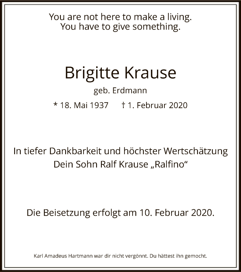 Hier finden Sie alle Traueranzeigen aus der Zeitung, die bisher für Brigitte Krause erschienen sind. Weitere Traueranzeigen, die in der Zeitung erscheinen, werden hier ebenfalls aufgelistet