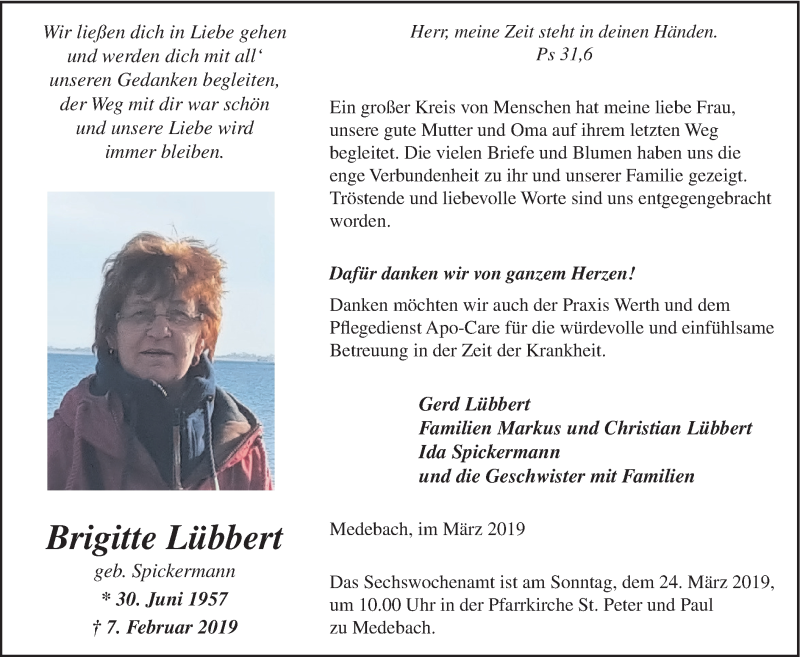 Hier finden Sie alle Traueranzeigen aus der Zeitung, die bisher für Brigitte Lübbert erschienen sind. Weitere Traueranzeigen, die in der Zeitung erscheinen, werden hier ebenfalls aufgelistet