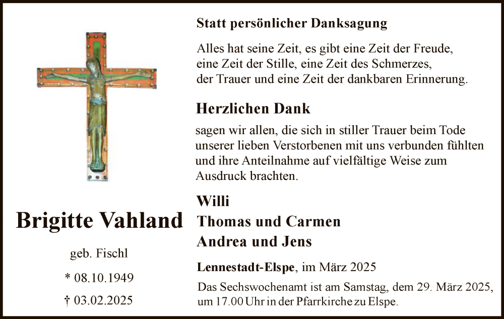 Hier finden Sie alle Traueranzeigen aus der Zeitung, die bisher für Brigitte Vahland erschienen sind. Weitere Traueranzeigen, die in der Zeitung erscheinen, werden hier ebenfalls aufgelistet
