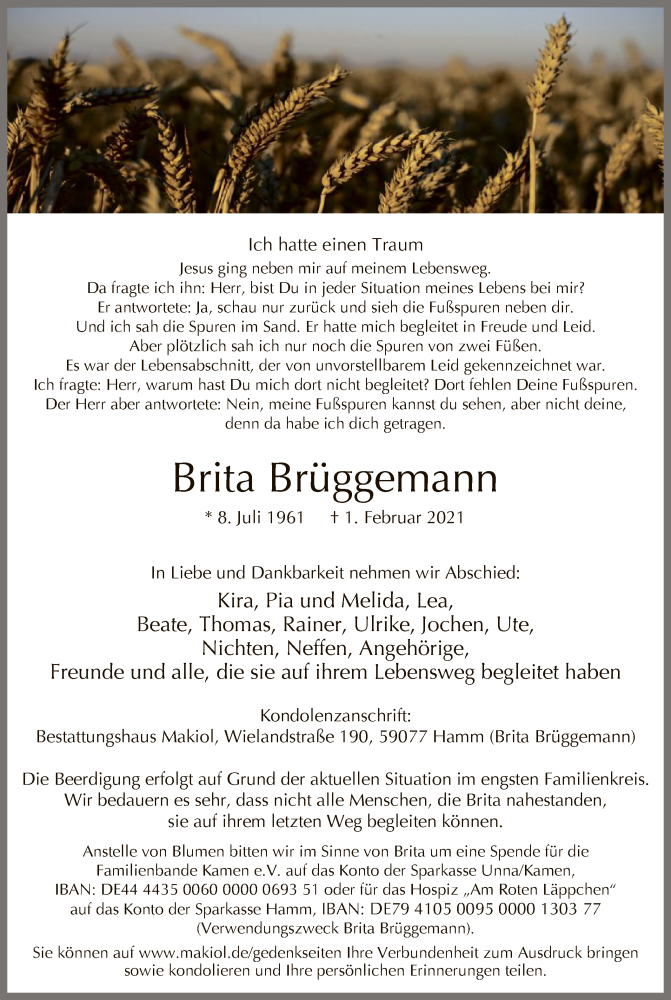 Hier finden Sie alle Traueranzeigen aus der Zeitung, die bisher für Brita Brüggemann erschienen sind. Weitere Traueranzeigen, die in der Zeitung erscheinen, werden hier ebenfalls aufgelistet