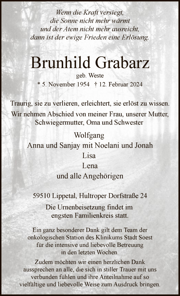 Hier finden Sie alle Traueranzeigen aus der Zeitung, die bisher für Brunhild Grabarz erschienen sind. Weitere Traueranzeigen, die in der Zeitung erscheinen, werden hier ebenfalls aufgelistet