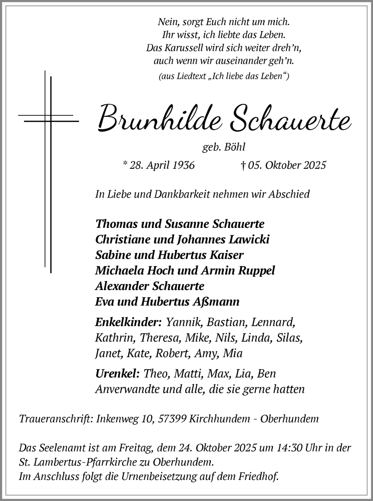 Hier finden Sie alle Traueranzeigen aus der Zeitung, die bisher für Brunhilde Schauerte erschienen sind. Weitere Traueranzeigen, die in der Zeitung erscheinen, werden hier ebenfalls aufgelistet