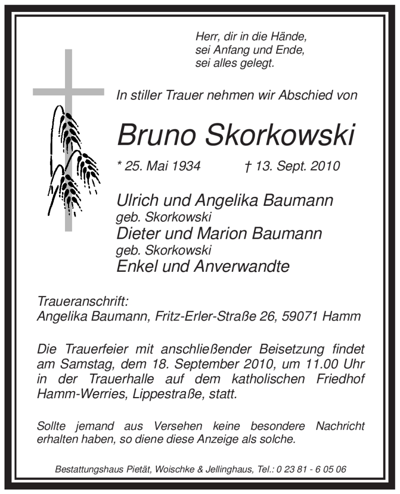 Hier finden Sie alle Traueranzeigen aus der Zeitung, die bisher für Bruno Skorkowski erschienen sind. Weitere Traueranzeigen, die in der Zeitung erscheinen, werden hier ebenfalls aufgelistet
